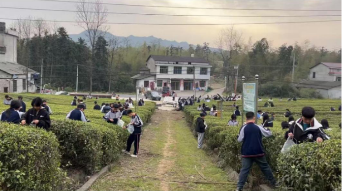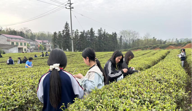 图为2024年鸬鹚渡镇中学“采茶劳动实践活动”