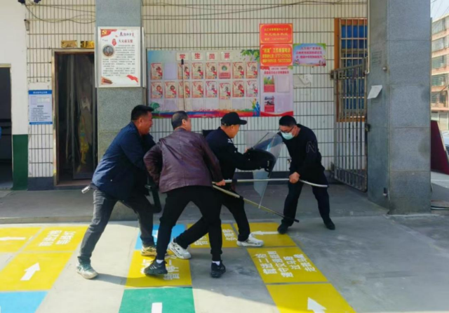 一阵急促的警报声骤然在校园内响起,宣告演练正式拉开帷幕。演练设定场景为一名“暴恐分子”意图强行闯入校园,安保人员发现后立即上前阻拦,并迅速按下一键报警装置。南嘴镇中心小学的老师们听到警报后,迅速组织学生疏散,引导孩子们躲进教室,紧闭门窗,用桌椅等物品堵住门口,避免“暴恐分子”闯入。与此同时,学校应急小组迅速集结,手持钢叉、盾牌等防暴器械,与“暴恐分子”周旋,尽可能拖延时间等待警方支援。