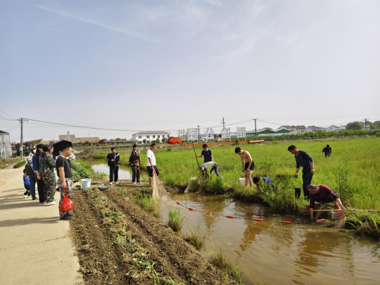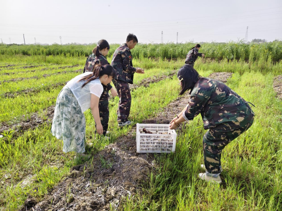 清晨的丝瓜小镇绿意盎然,学生们在教官的指导下分成实践小队,有序开展农事体验。池塘畔,学生们卷起裤腿踏入清凉池水,在合作围捕中收获活蹦乱跳的鲜鱼;泥塘摸虾环节更成为欢声笑语的海洋,不少同学首次体验到“浑水摸虾”的农耕智慧。菜地里,家委会代表化身“田间导师”,手把手教授学生巧摘蘑菇,强调“一粥一饭当思来处不易”的劳动价值。