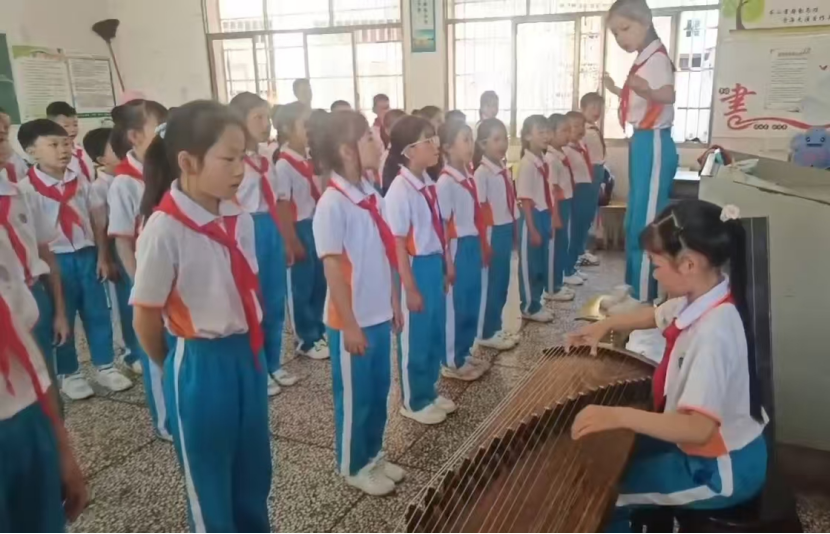 比赛中,各班依次献唱。既有《歌唱祖国》《我们的田野》等经典曲目的深情演绎,也有《多美好》《有群这样的人》等本土原创歌曲的创意呈现。四年级(123)班学生们手持红星道具,在《红星歌》的合唱中释放"爱国少年"的满腔热情;三年级(125)班创新融入古筝伴奏,展现传统文化的独特魅力。各班精心设计,队形新颖,既突出合唱艺术性,更彰显"以美育人"的核心理念。