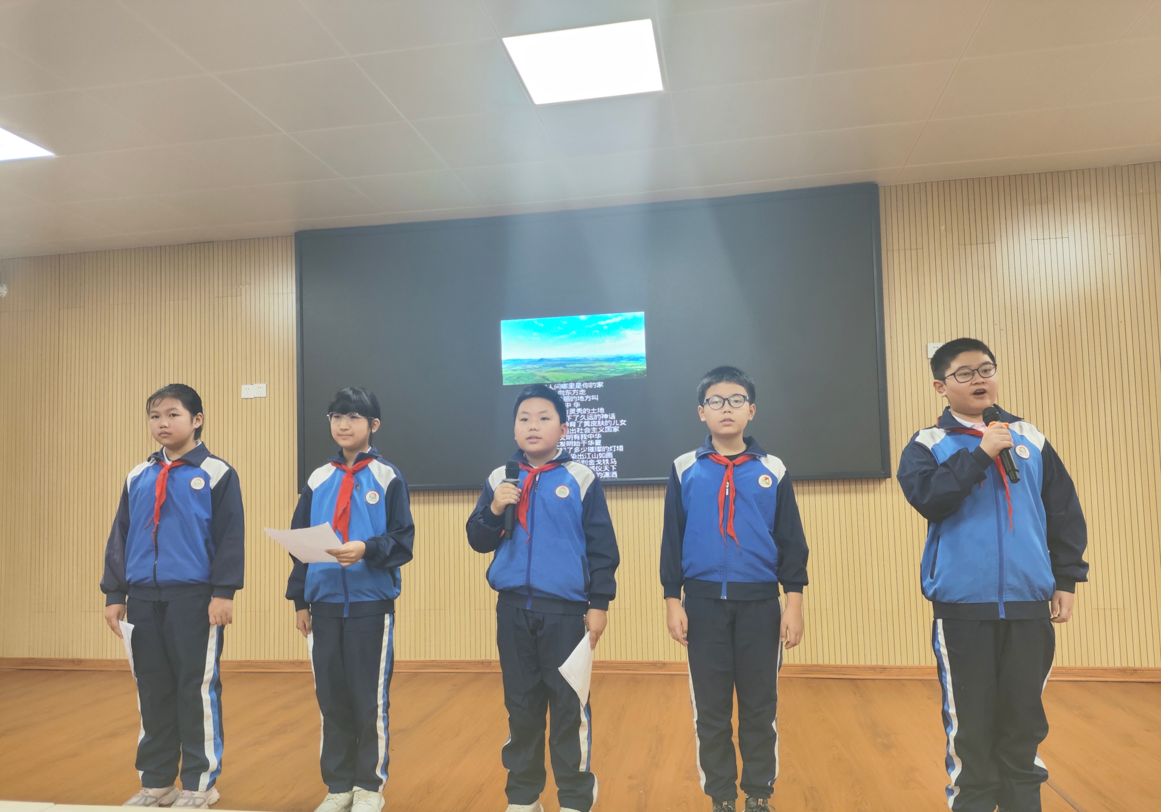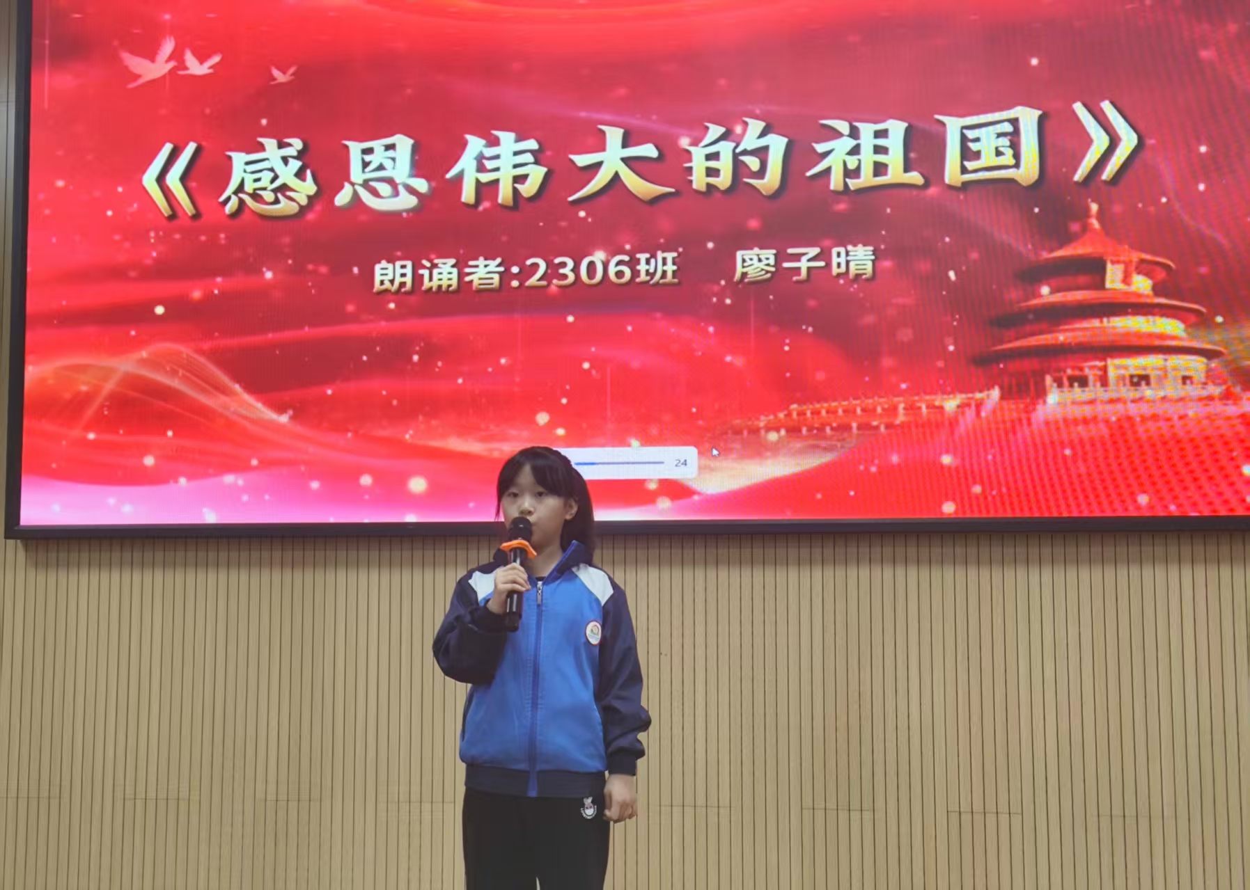比赛现场,选手们各展风采。2202班集体朗诵《繁星》用稚嫩声音铺开温馨画卷,2102班汪晓俣《石小少年说》诉说少年心声,2001班王晨宇、2103班陈雅璐先后朗诵《这盛世 如您所愿》传递对祖国的深情;还有《感恩伟大的祖国》《读中国》《秋天里的中国》《红旗的一角》《沁园春・雪》《强国力量》等作品。或感恩祖国、或描绘山河、或传承红色基因、或抒发强国志向,选手们发音标准、情感饱满,部分作品搭配背景音乐与PPT,更有肢体动作、队形变化加持,充分展现出石小少年的爱国热情与精神风貌。