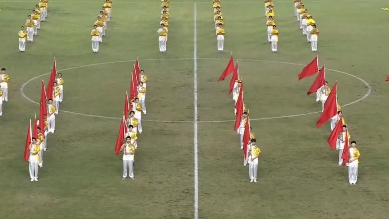 演出伊始,同学们精神抖擞,奔跑入场。他们手持彩旗,在广阔的足球场上奋力挥动,瞬间点燃了现场气氛。随后,同学们变换队形,手持彩扇,动作整齐划一,时而如波涛起伏,时而如繁花绽放,用舞姿展现出磅礴的气势与青春的活力。