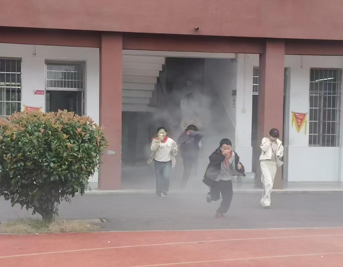 警报响起后,各班教师迅速组织学生进入紧急疏散状态。学生们用湿毛巾或手肘捂住口鼻,弯腰低姿,沿预定路线快速、有序撤离。各楼层疏导教师指挥得当,确保通道畅通。整个过程紧张有序,全校四百余名师生仅用不到3分钟便全部安全抵达操场集合点。