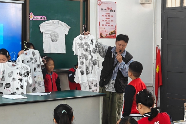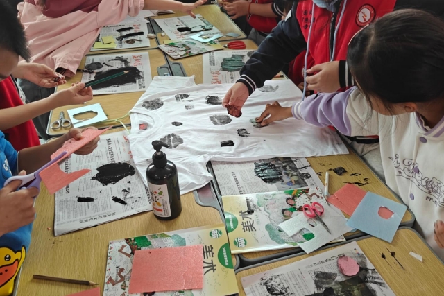 随后,活动转至2204班教室,中小张宏斌老师开展美术拓印课。他展示多种拓印材料,讲解手法与色彩搭配技巧,引导学生自主选择材料创作,鼓励发挥想象组合图案,部分学生将作品与自身结合,呈现创意画面,观摩教师近距离观察并交流教学细节。