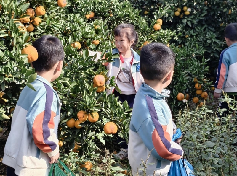 同一秋日,黄家湖橘园里,大班孩子踮脚摘果的身影跃动在枝桠间。“表皮光滑、颜色橙黄、掂着沉的橘子才够甜够水!”跟着老师的“选果秘诀”,孩子们把黄澄澄的橘子揣满袋子。“这是我第一次自己摘橘子,比超市买的甜多了!”一位小朋友举着满满的果实,向同伴分享自己的发现。