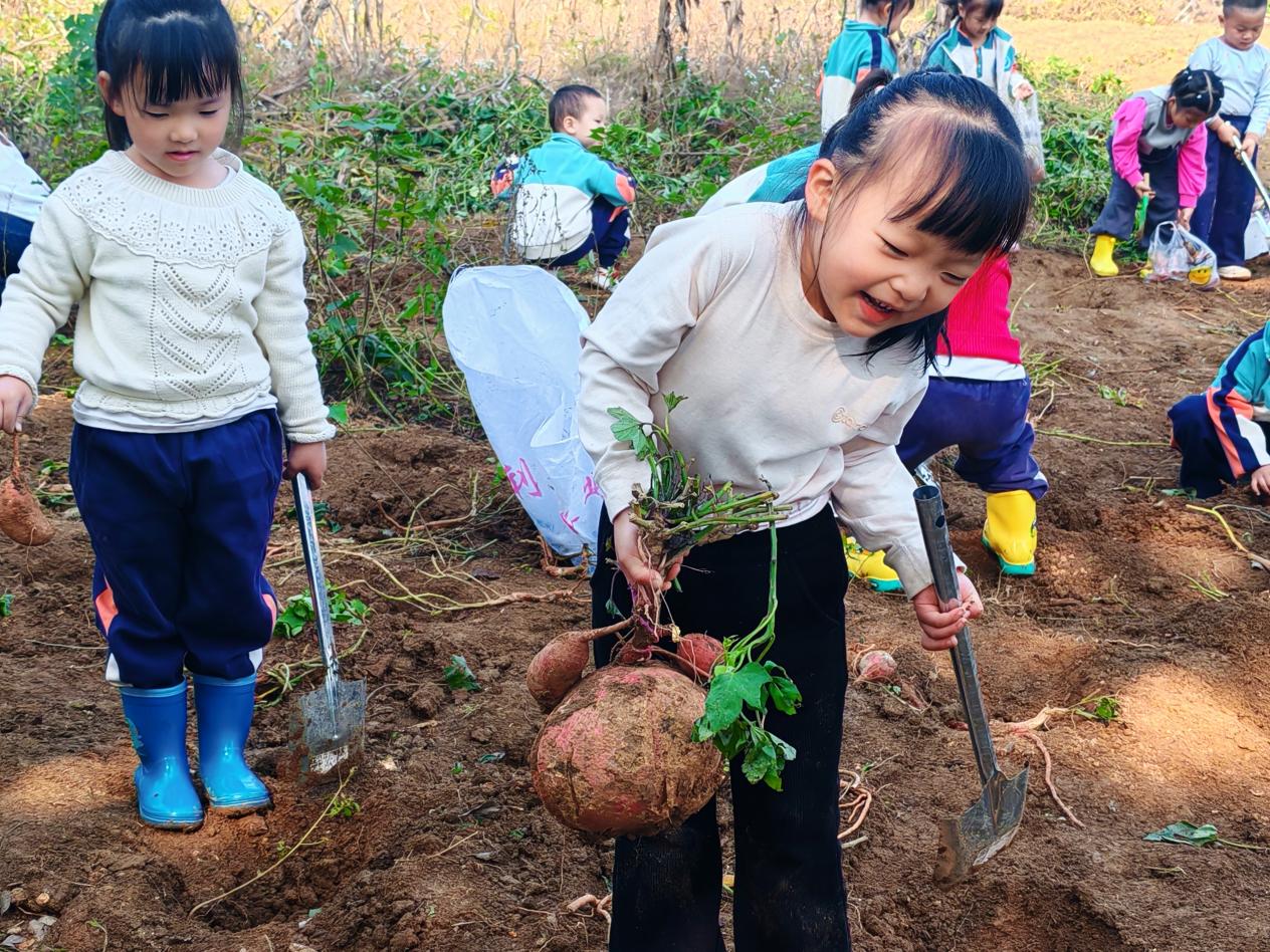 银光小镇的田埂上,小班、中班的“小农夫”们举着小铲子,在泥土里“寻宝”。“老师你看,这个红薯长了小尾巴!”“我挖的红薯有西瓜这么大!”稚嫩的童言与清脆的笑声,在田间地头久久回荡。据悉,园方提前备好安全工具、踩点清障,让孩子们放心“解锁”农耕初体验,泥土的芬芳里,藏着“春种秋收”的第一课。