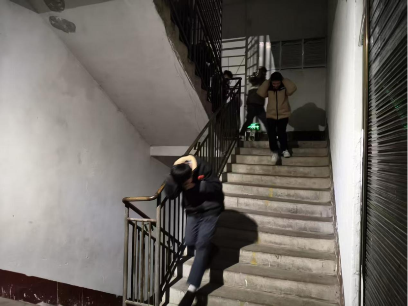 19时30分,急促的警报声骤然划破校园静谧,演练正式启动。宿舍区照明电源瞬间切断,楼道与寝室随即陷入一片“黑暗”。危急情境下,各寝室学生在值班老师与宿管老师的沉着指挥下,毫秒响应、迅速进入应急状态。同学们始终保持临危不乱的心态,熟练运用日常安全教育中掌握的逃生技巧:俯身低姿、双手紧捂口鼻,沿着墙壁预设的荧光疏散指示标志,在应急逃生门微弱灯光的指引下,快速且有序地向预定安全集结点撤离。