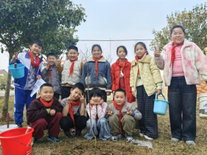 植树区内一片热火朝天的劳动景象。党员教师袁龙、汤怀菀、王熔率先垂范,挥锹铲土、扶苗填坑、提水浇灌,每个环节都一丝不苟。“坑要挖深,土要踩实,水要浇透……”党员教师们一边劳动,一边耐心指导学生,将劳动的课堂搬到阳光下、泥土里。在他们的带动下,学生们分组协作,高低年级互助配合,有的小心翼翼扶正树苗,有的提着水桶来回奔波。稚嫩的脸庞上挂满汗珠,眼中却闪烁着兴奋的光芒。
