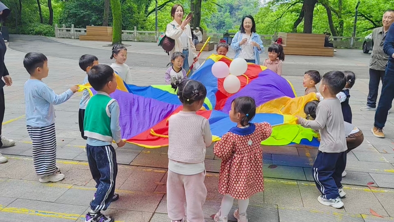 徒步途中,孩子们精神饱满、有序前行,在春日里感受大自然的清新与美好。到达活动场地后,大家一起玩彩虹伞、追泡泡、玩气球,欢声笑语不断,现场热闹又温馨。