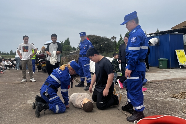 志愿者们利用模拟人现场演示了心肺复苏的操作流程,从判断意识、呼叫救援、胸外按压到人工呼吸,每一步都讲解细致。同学们踊跃上台操作,在专业人员的指导下纠正动作。一位八年级学生说:“以前觉得溺水离我们很远,今天才知道学会这些技能关键时刻能救命。”
