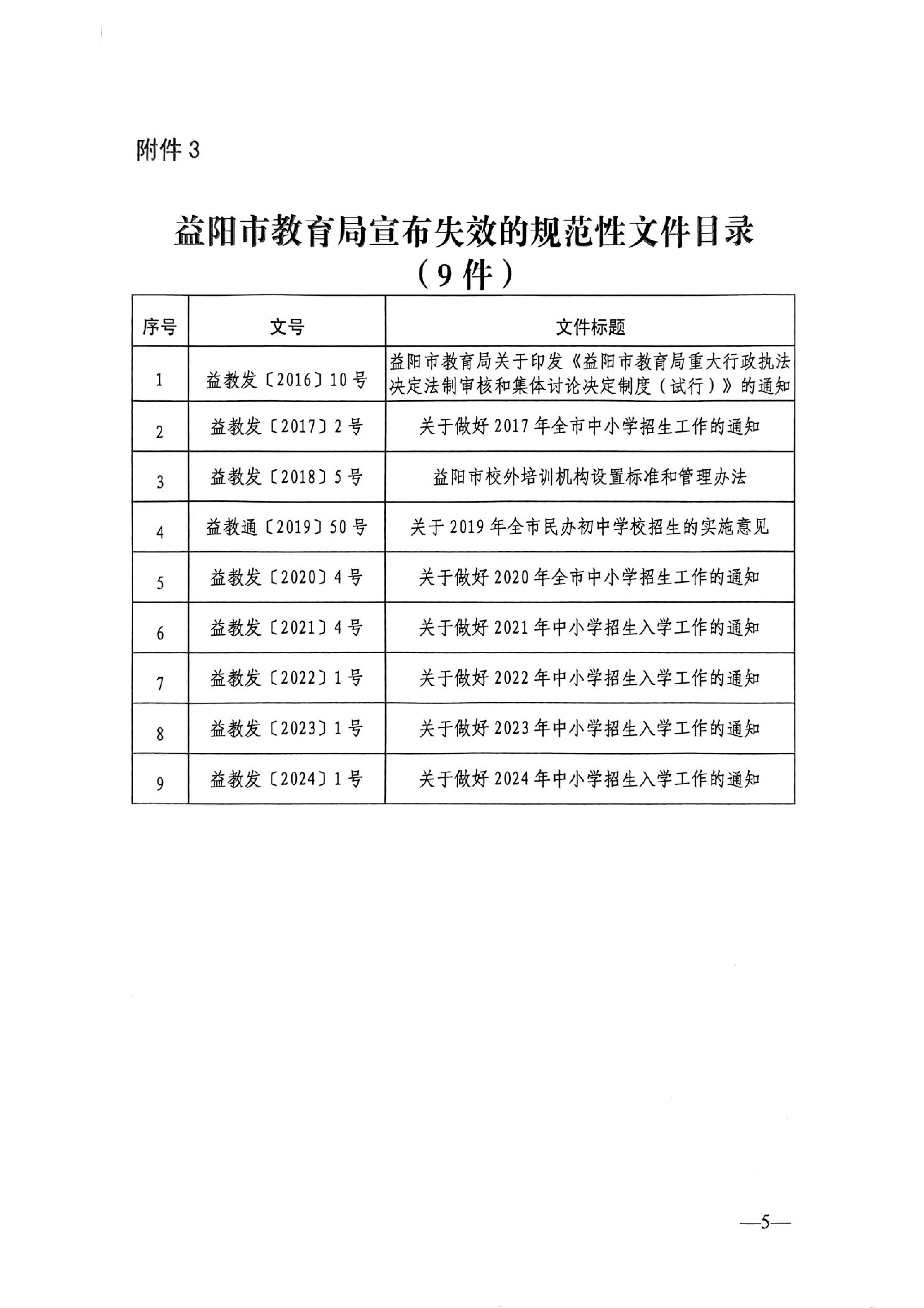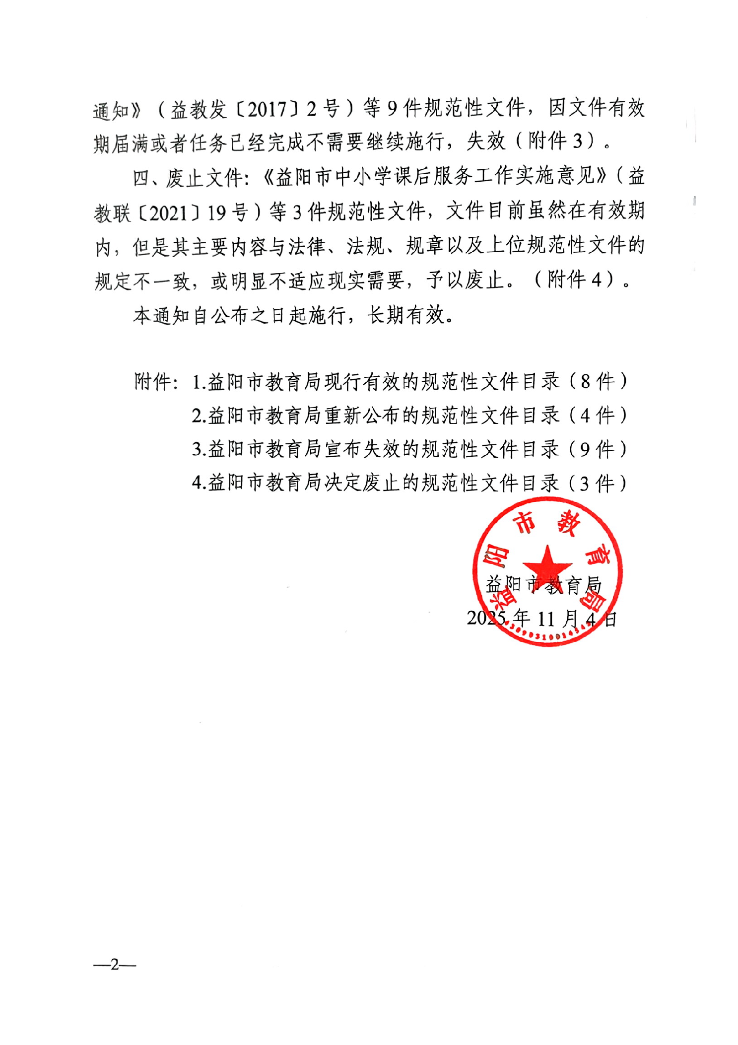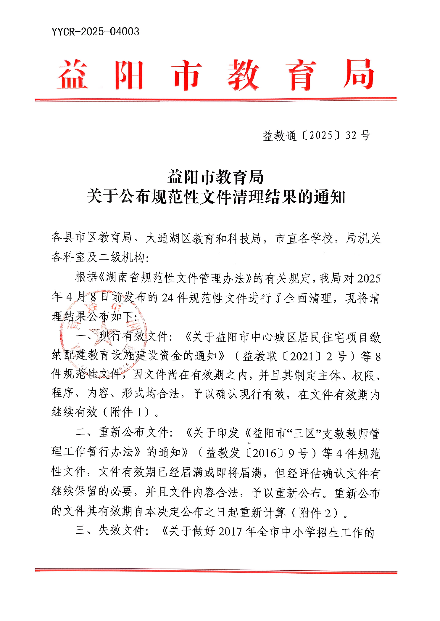 益阳市教育局关于公布规范性文件清理结果的通知