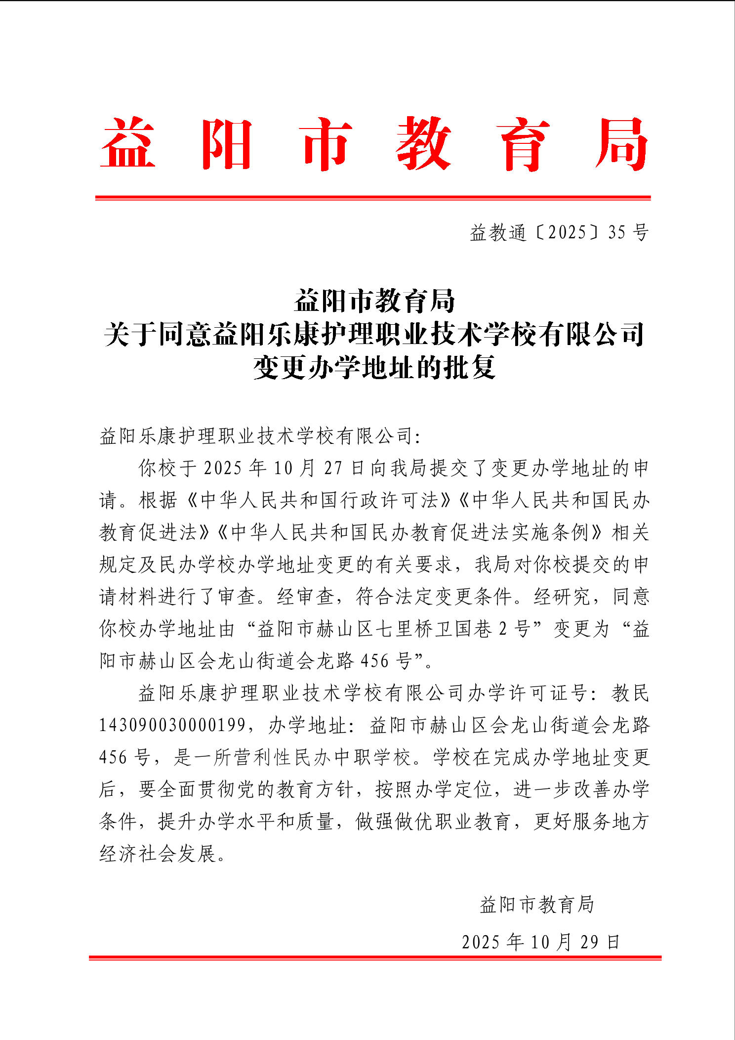 益阳市教育局关于同意益阳乐康护理职业技术学校有限公司变更办学地址的批复